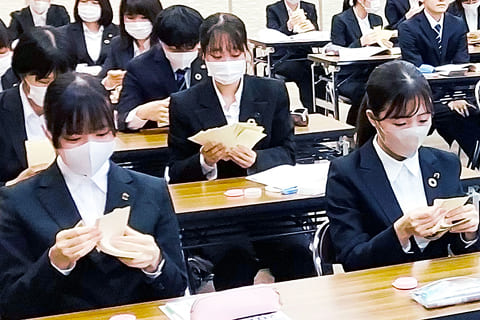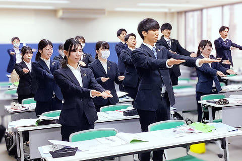 マナー研修では身だしなみから始まり姿勢や返事、電話応対等1日かけて社会人に必要なマナーを身につけます。