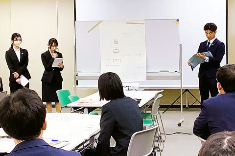時には新入職員同士意見のプレゼンや発表を交えながら、研修を進めます。